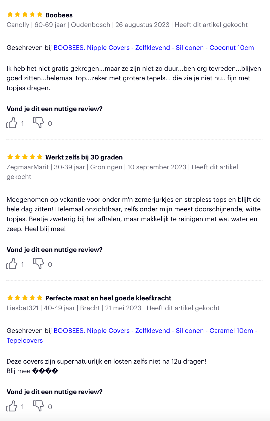 Ik ben zeer tevreden over de verzendsnelheid, het bestelproces en natuurlijk de nipple covers. De persoonlijke touch met het briefje met naam en hartje vond ik heel leuk